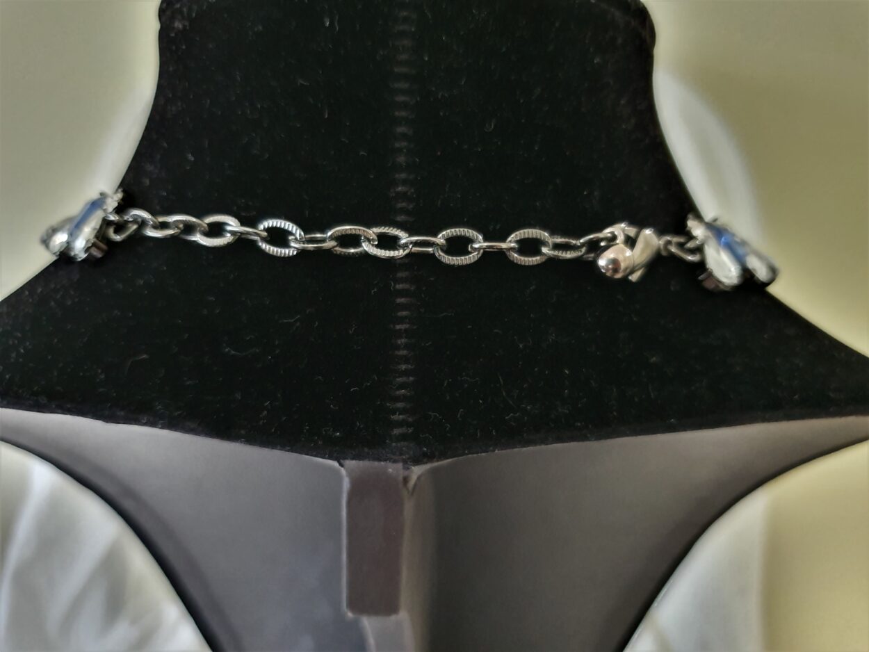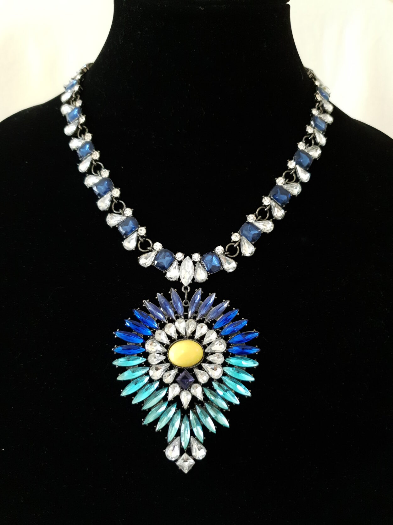 Beautiful necklace with blue and clear beads with a sun yellow bead highlight, very festive