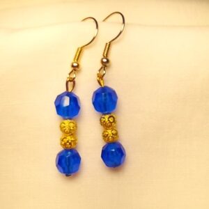 These eye catching blue and gold bead earrings are sure to add a touch of elegance to any outfit. The combination of vibrant blue beads and shimmering gold beads creates a beautiful contrast, perfect for any occasion. Hand made.