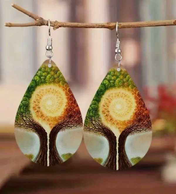 Bohemian Style Wooden Water Drop Earrings, beautiful abstract Tree of Life design.