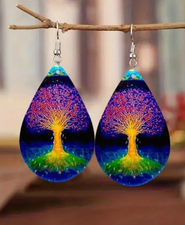 Bohemian Style Wooden Water Drop Earrings, vibrant Tree of Life design.