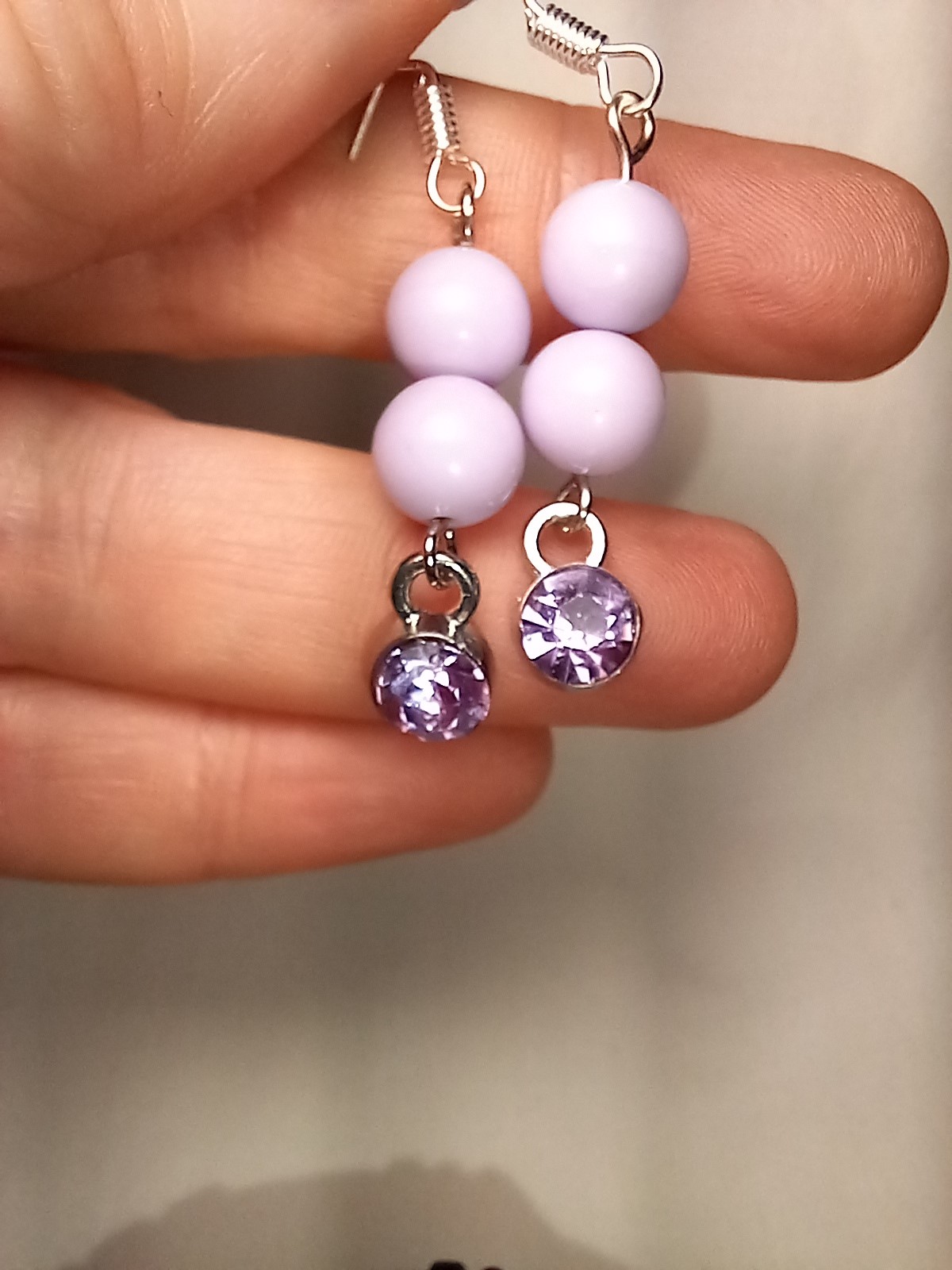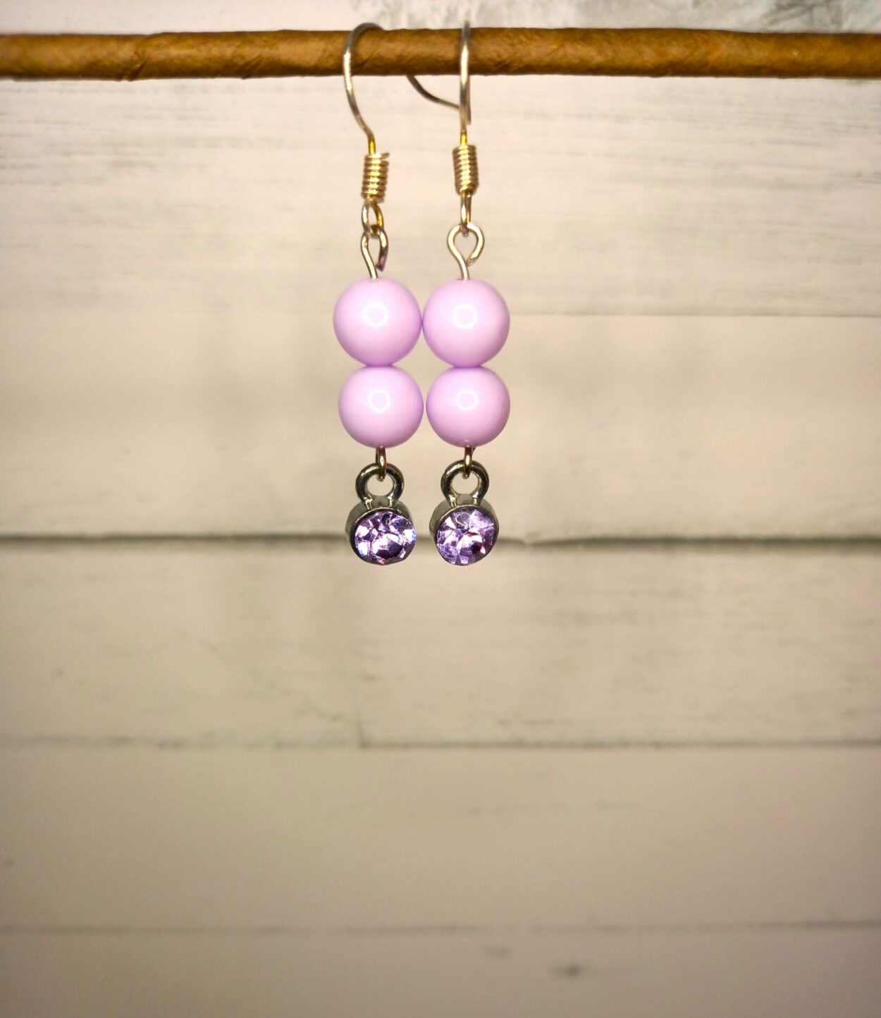 Charming purple bead earrings with a purple imitation gem drop. These earrings boast a lovely shade of purple with the eye catching purple gem at the end, it catches the light and sparkles with every movement. Handmade with care.