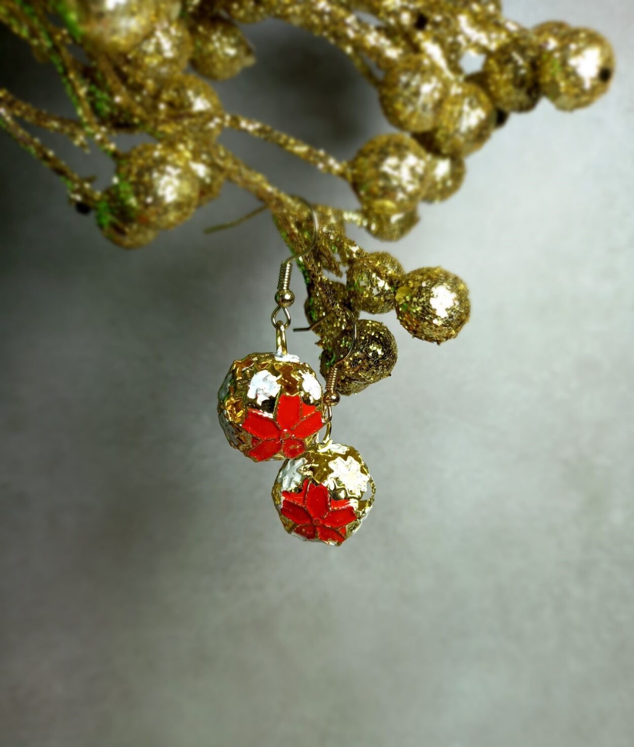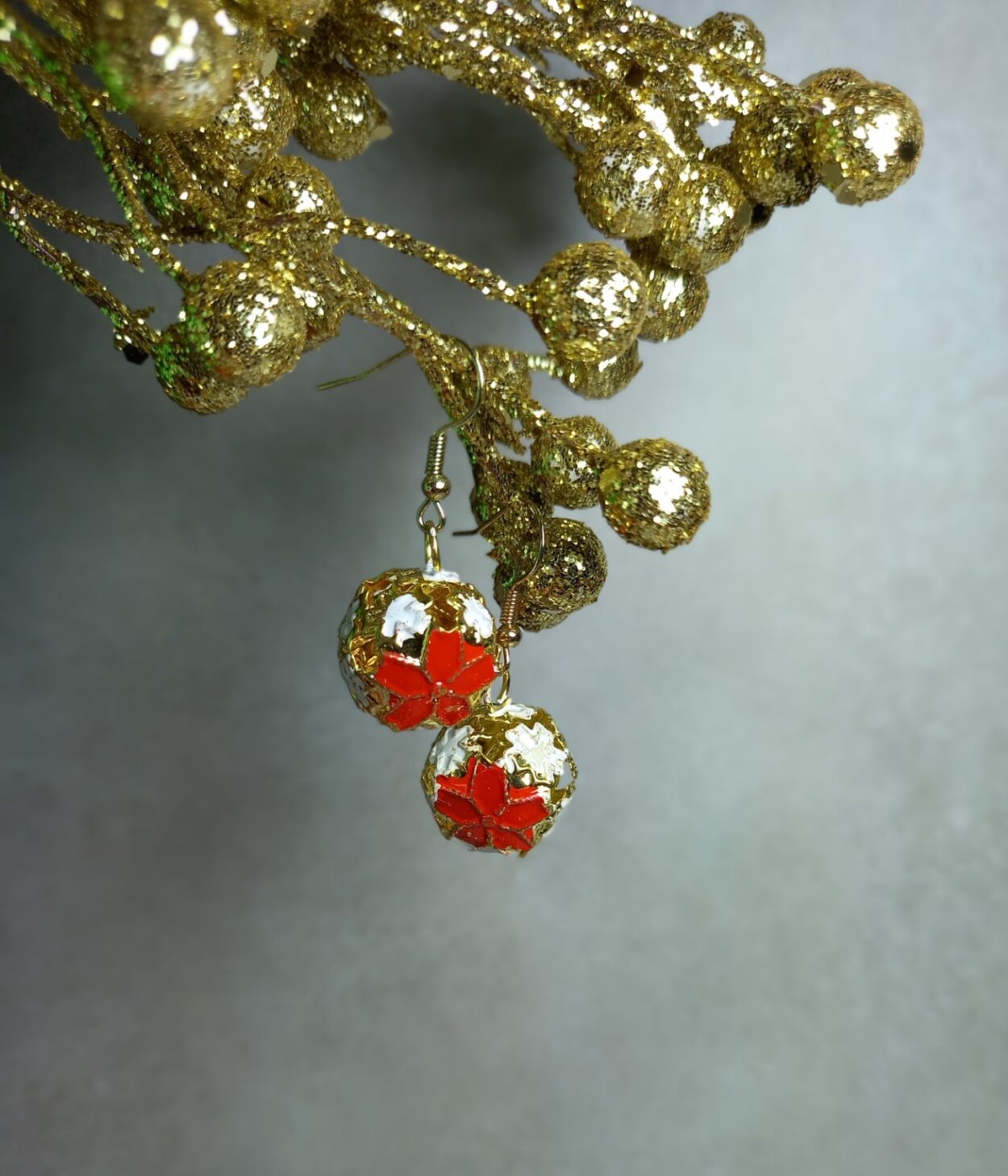 These Christmas bell earrings are festive cheer. The earrings feature a delicate gold coloured cage design featuring a red flower and white miniature like snowflakes. Handmade with care.