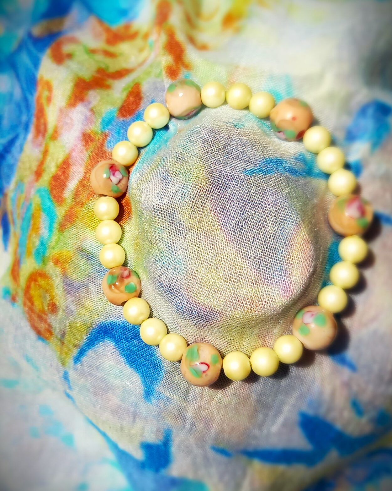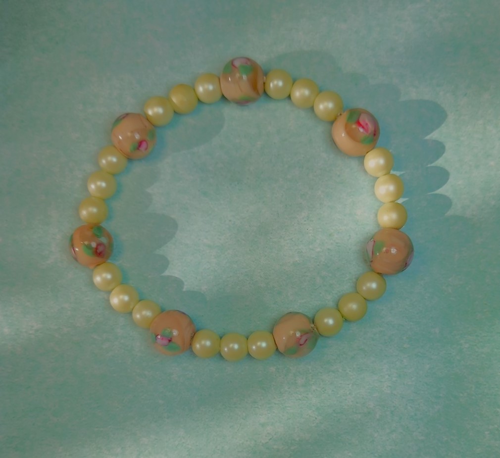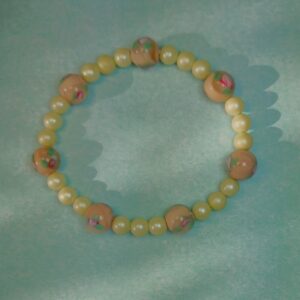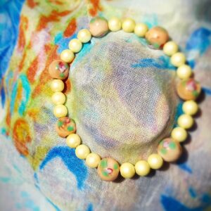 Add a touch of elegance to your everyday outfit with this stunning bracelet featuring a lustrous 4mm pearl-like bead accompanied by a large brown millefiori 8mm glass bead. This classic combination creates a harmonious blend of sophistication and charm. Perfect for adding a stylish accent to any ensemble, this bracelet is sure to make a statement wherever you go. Handmade 18cm gel elastic.