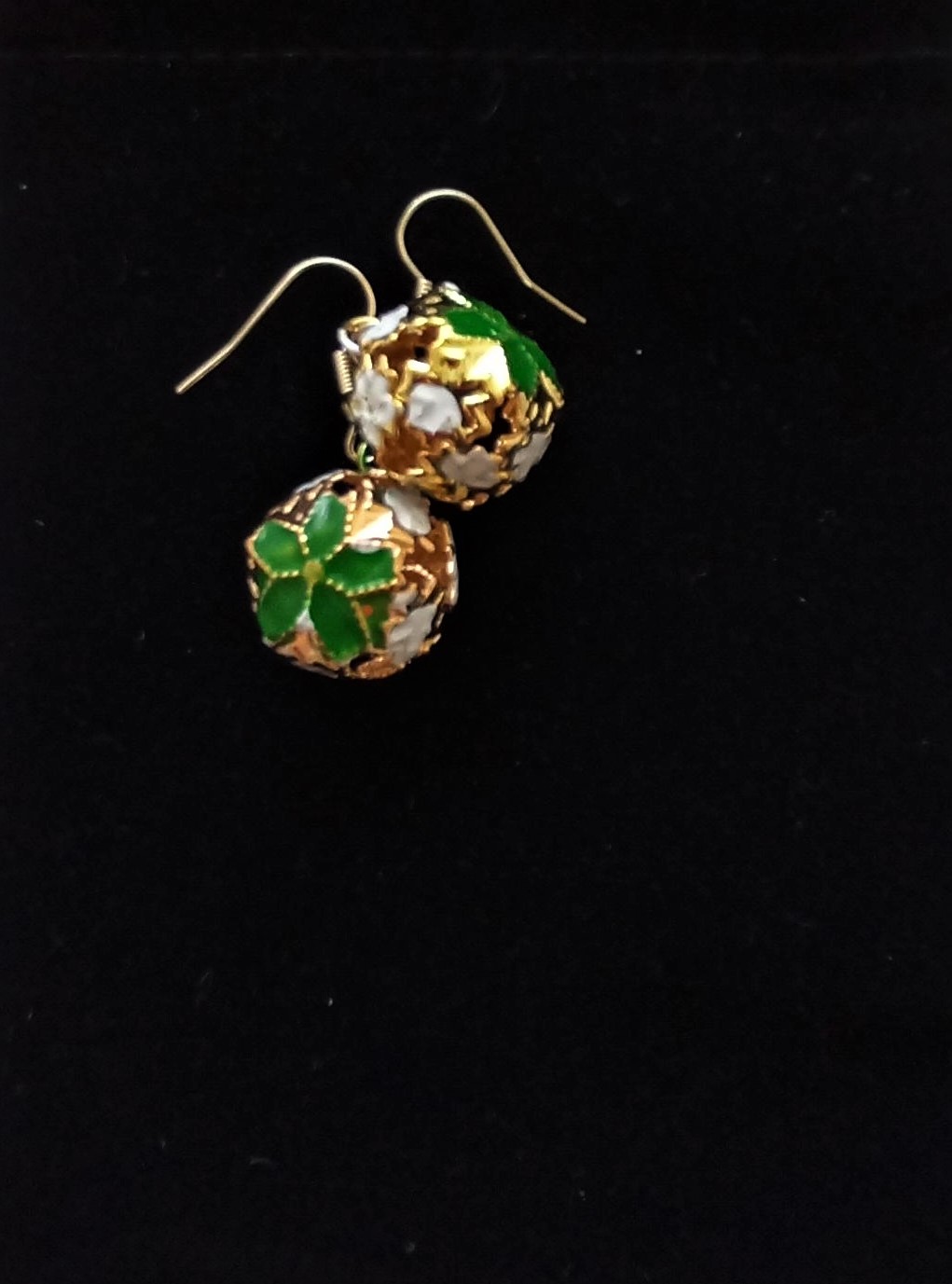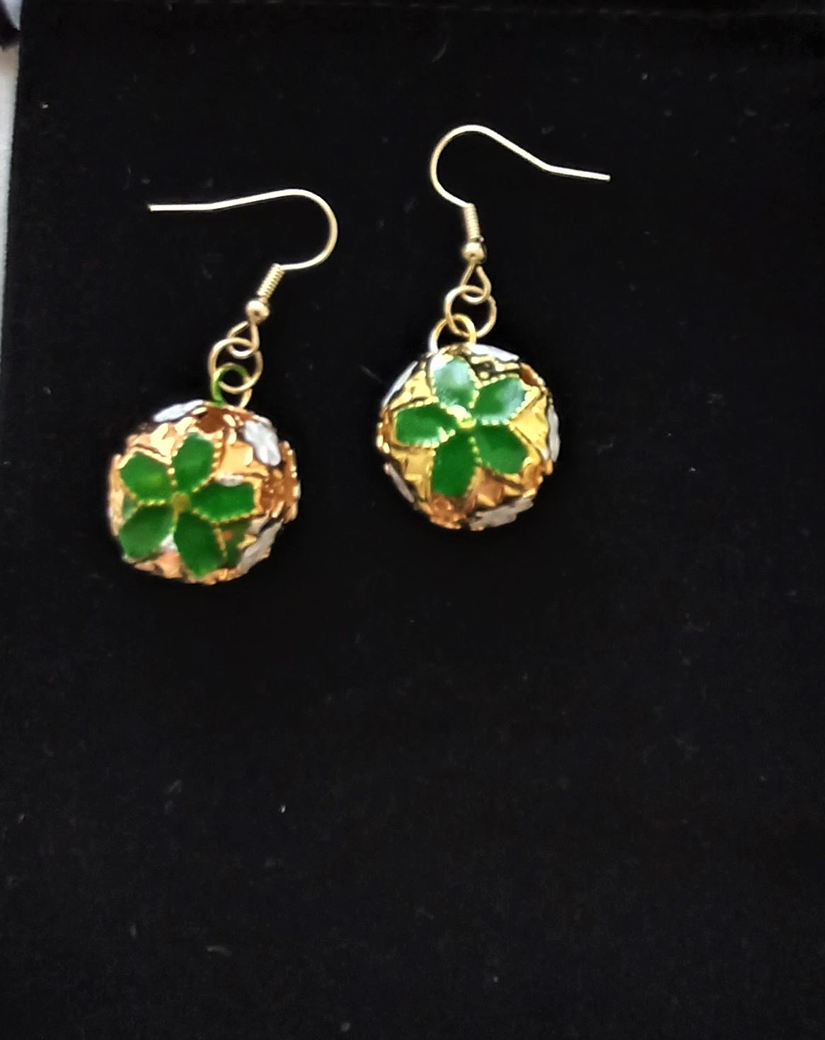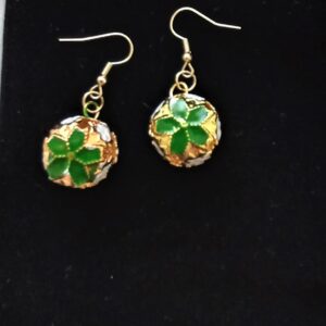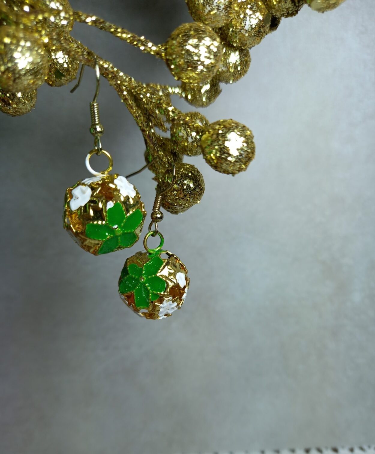 These Christmas bell earrings are festive cheer. The earrings feature a delicate gold coloured cage design featuring a green flower and white miniature like snowflakes. Handmade with care.