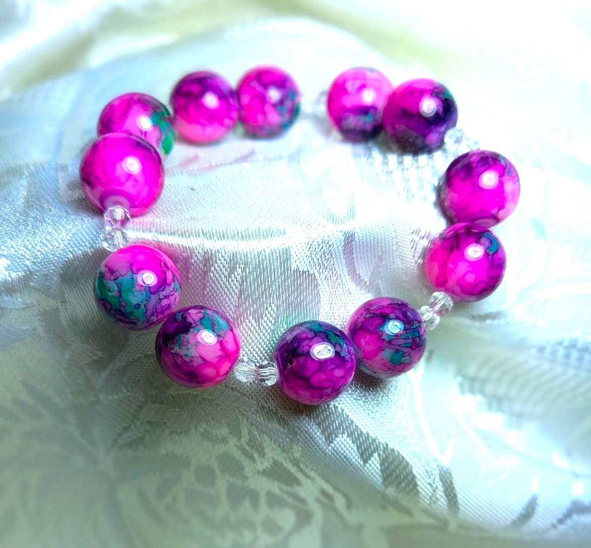 Add a pop of color to your wrist with this stunning 10mm pink and green bead bracelet! Handcrafted with love, this vibrant piece is perfect for adding a touch of fun to any outfit. The combination of pink and green beads creates a playful and eye-catching design that is sure to be a conversation starter. Whether you wear it alone or stack it with other bracelets, this bracelet is a must-have accessory for any jewelry lover.  Handcrafted with 10mm bead 18cm gel elastic.