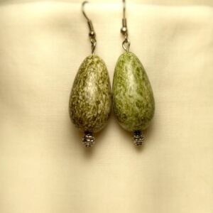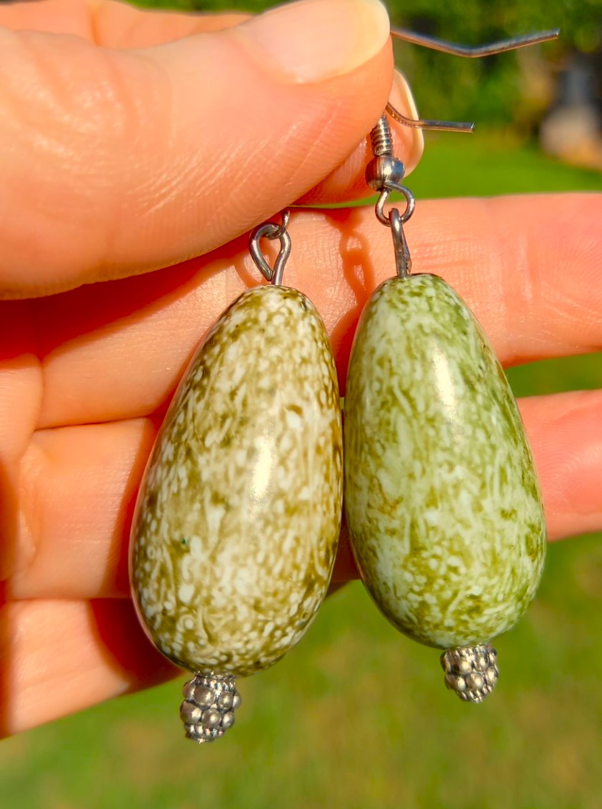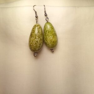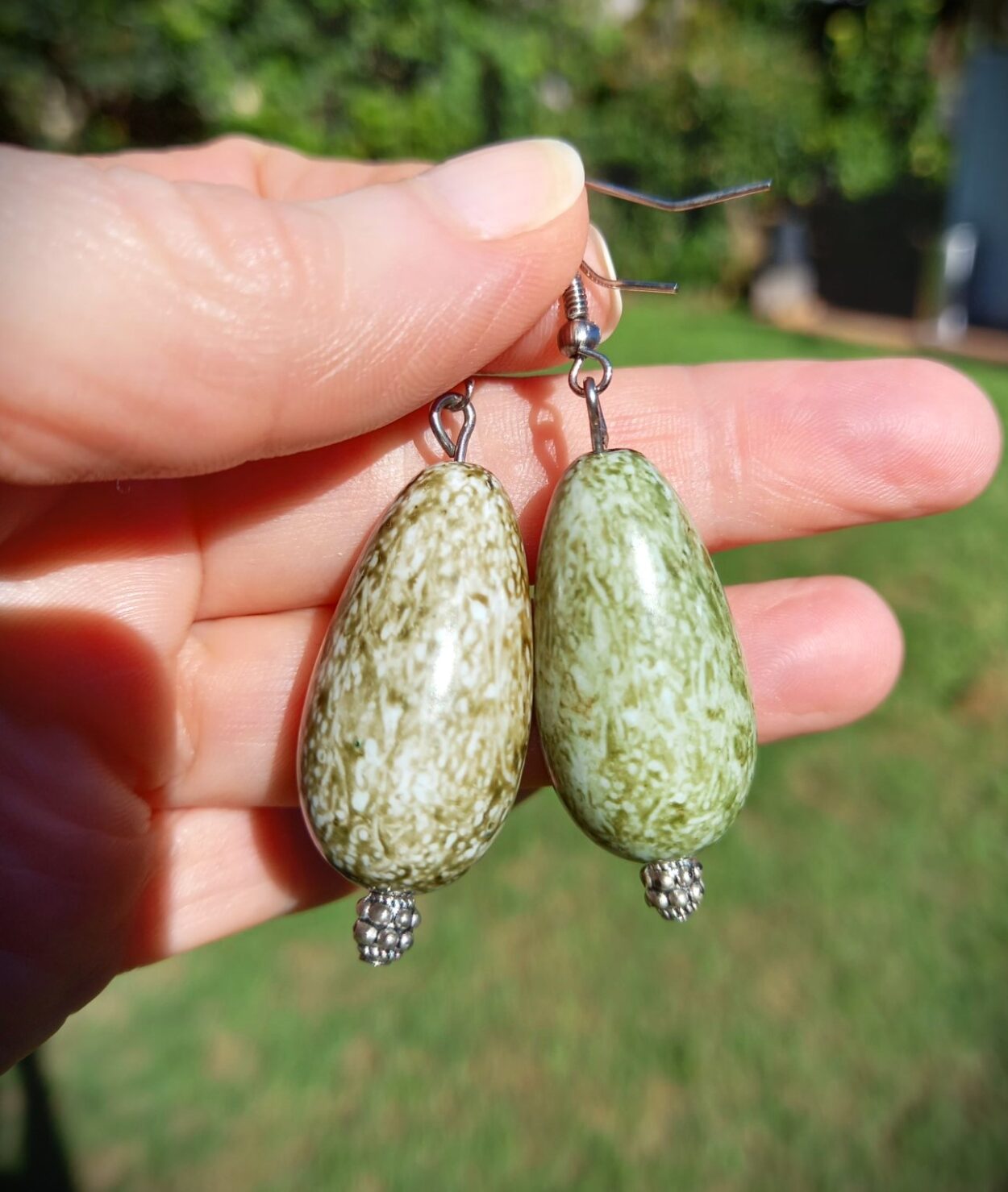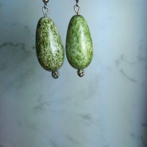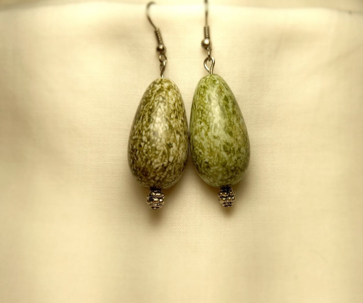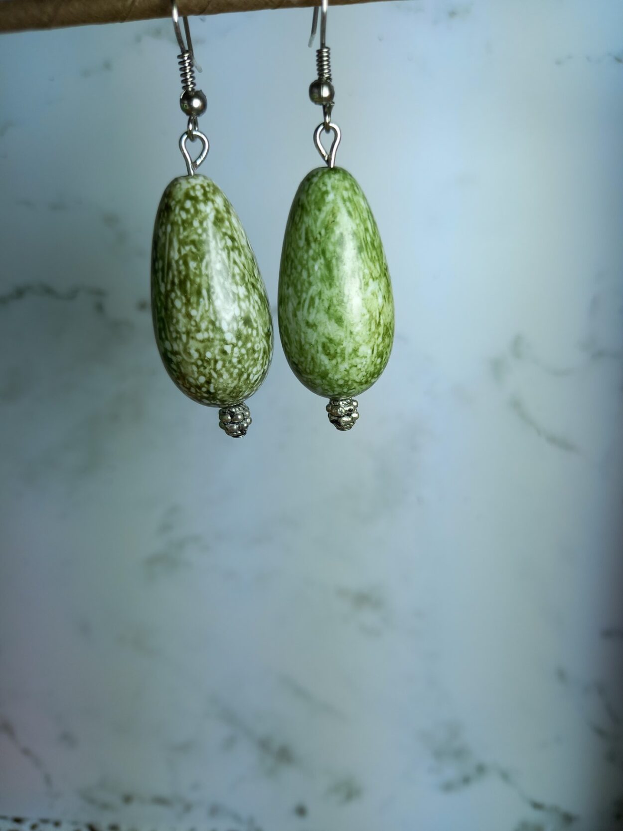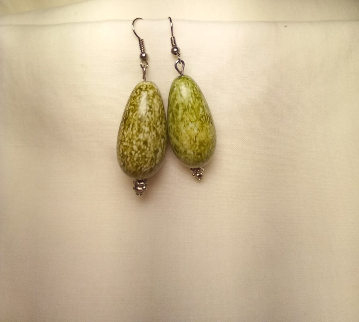 The green beads evoke a sense of nature and free-spiritedness. These earrings fit perfectly into a bohemian or hippie-inspired look. Finished with silver coloured fixings. Hand made apologies for the photos, these beads seem to be really difficult to get a good picture.