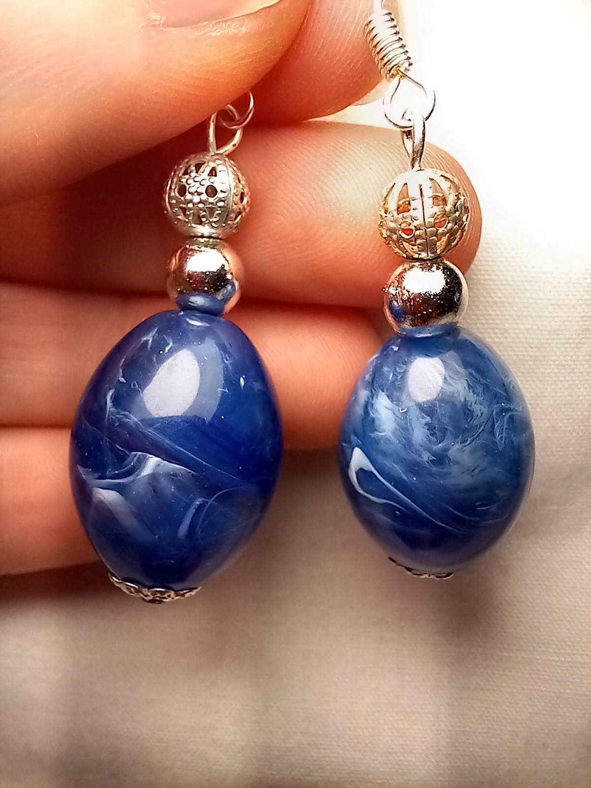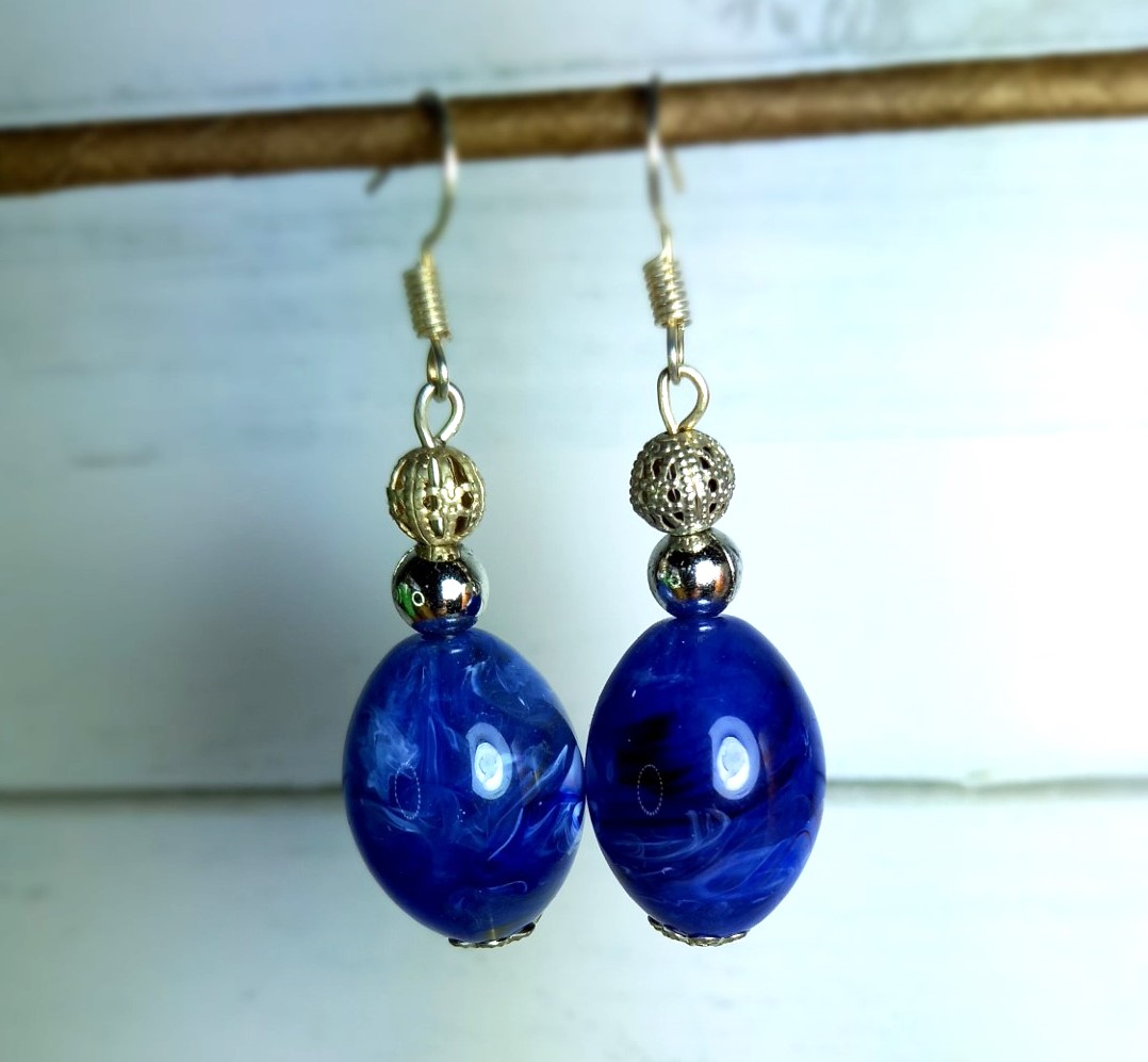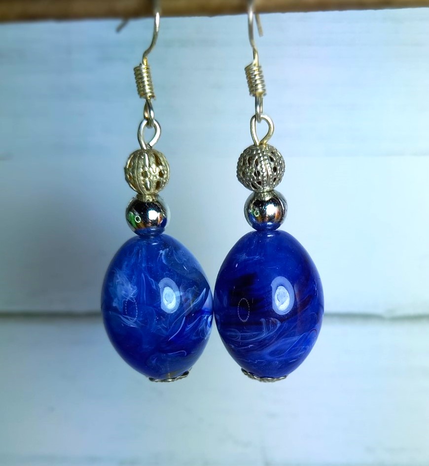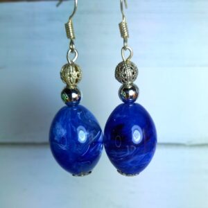 Look with these stunning blue and silver bead earrings. These earrings feature a beautiful combination of a shimmering solid silver beads, filigree silver bead and large, vibrant large blue bead. Perfect for adding a pop of colour to any outfit, these earrings are versatile and easy to wear. Handmade.