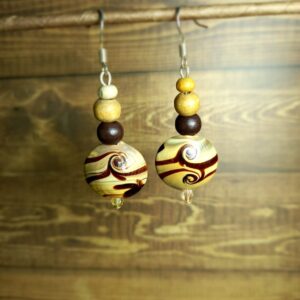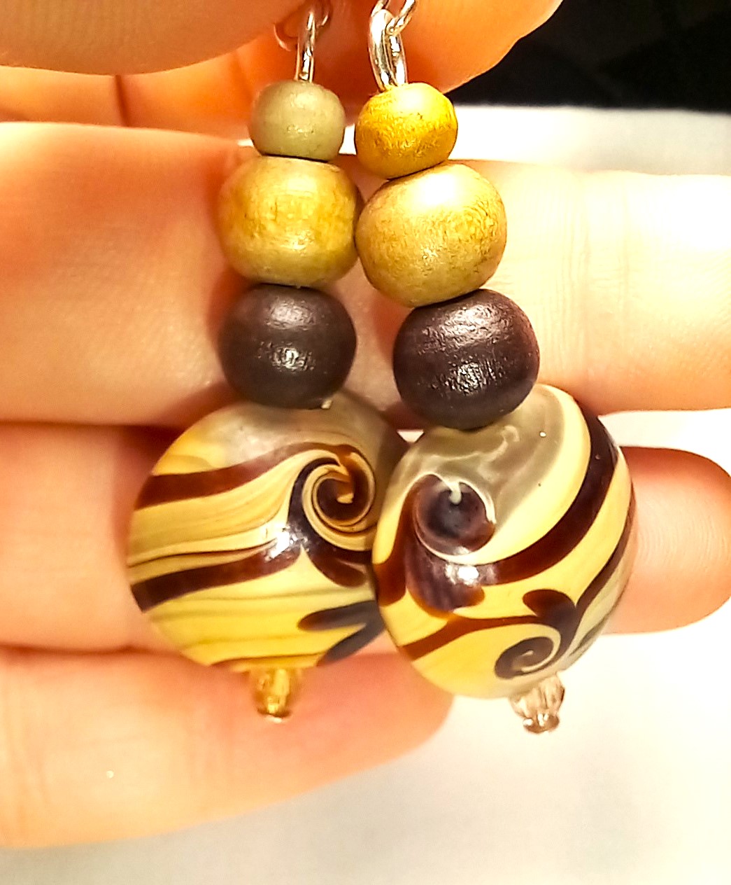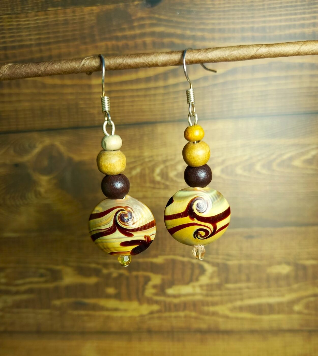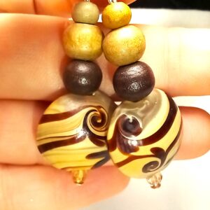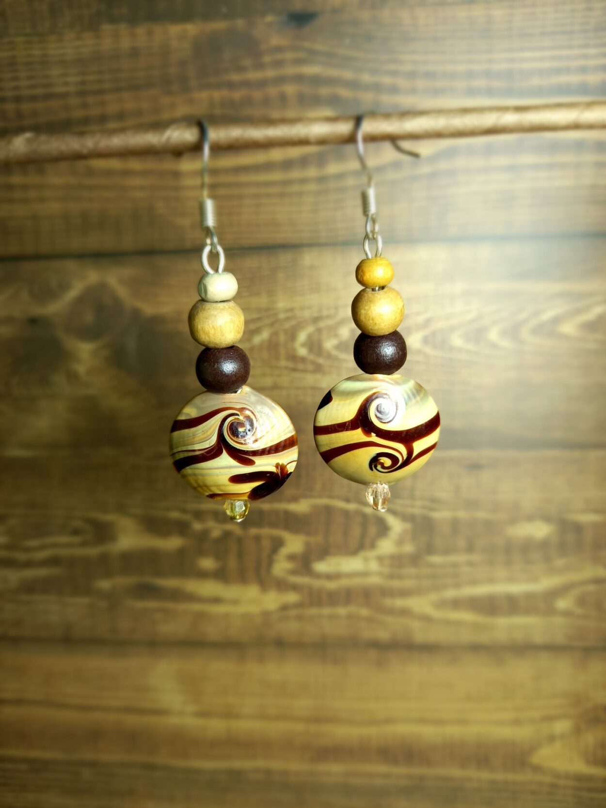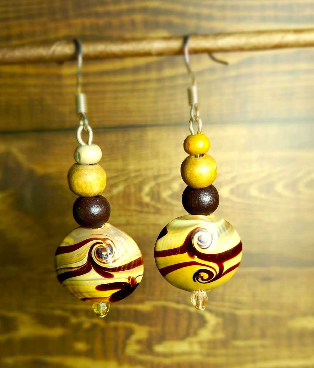 The central focus is on large glass beads with rich brown earthy hues with a glossy finish, adding depth to their appearance. The smaller wooden beads bring a rustic and natural charm. Pair them with neutral or complementary outfits to highlight their warm, brown tones. Hand made.