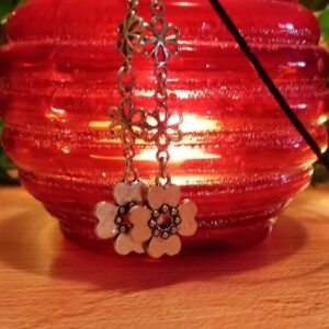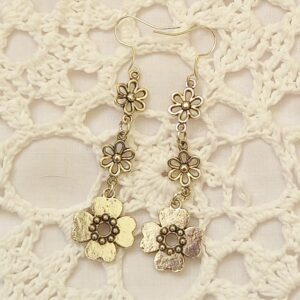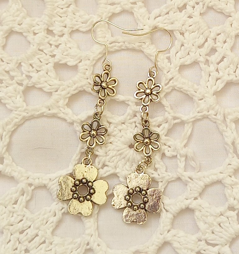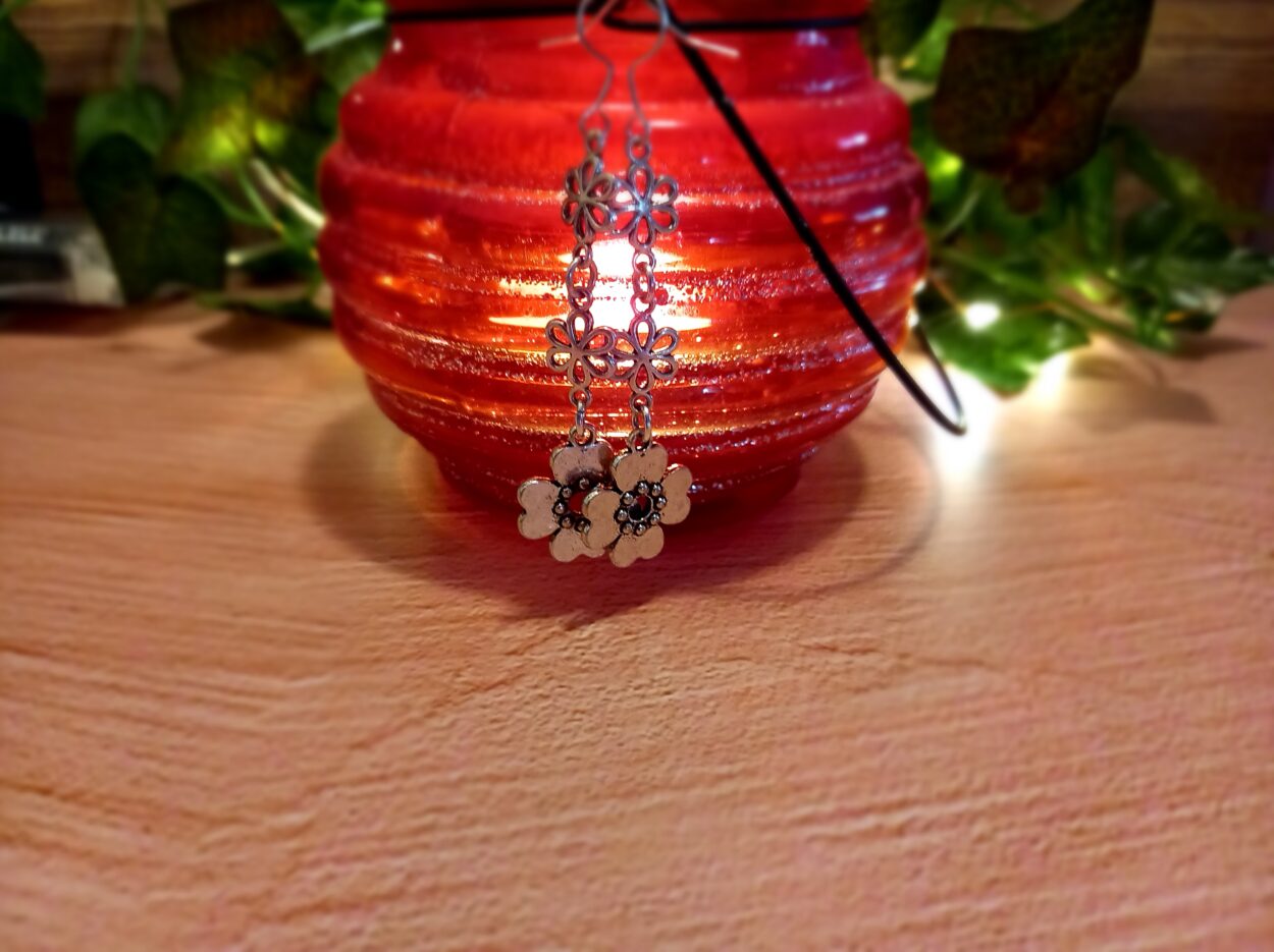 These delicate earrings are approximately 6cm long featuring 2 delicate silver coloured flowers leading down to the larger silver coloured flower, making them a fun accessory for any occasion. Handmade with care.