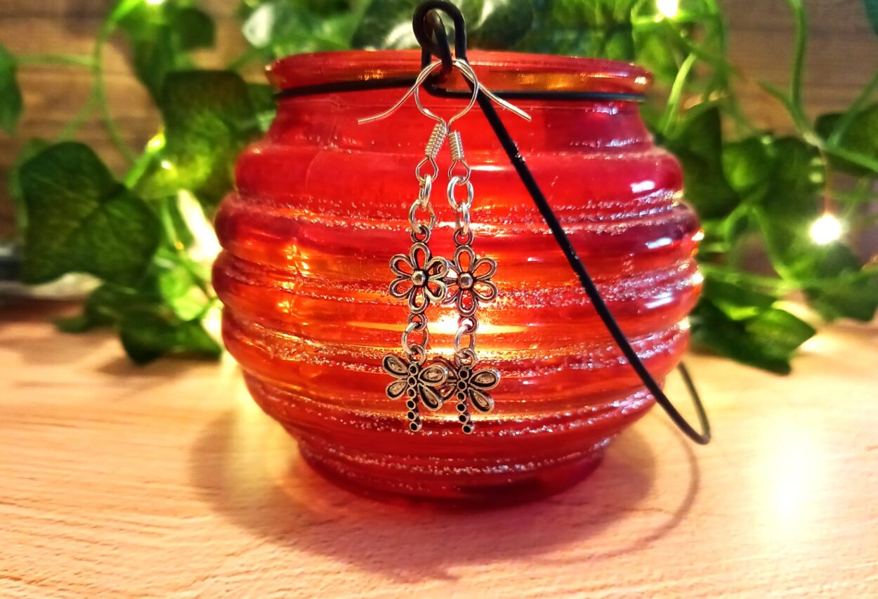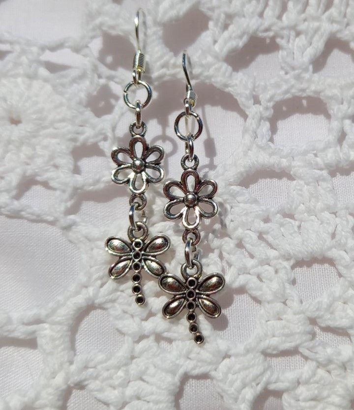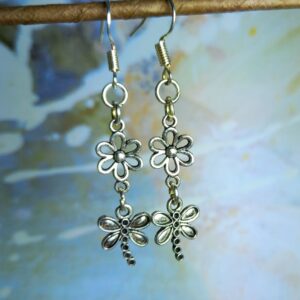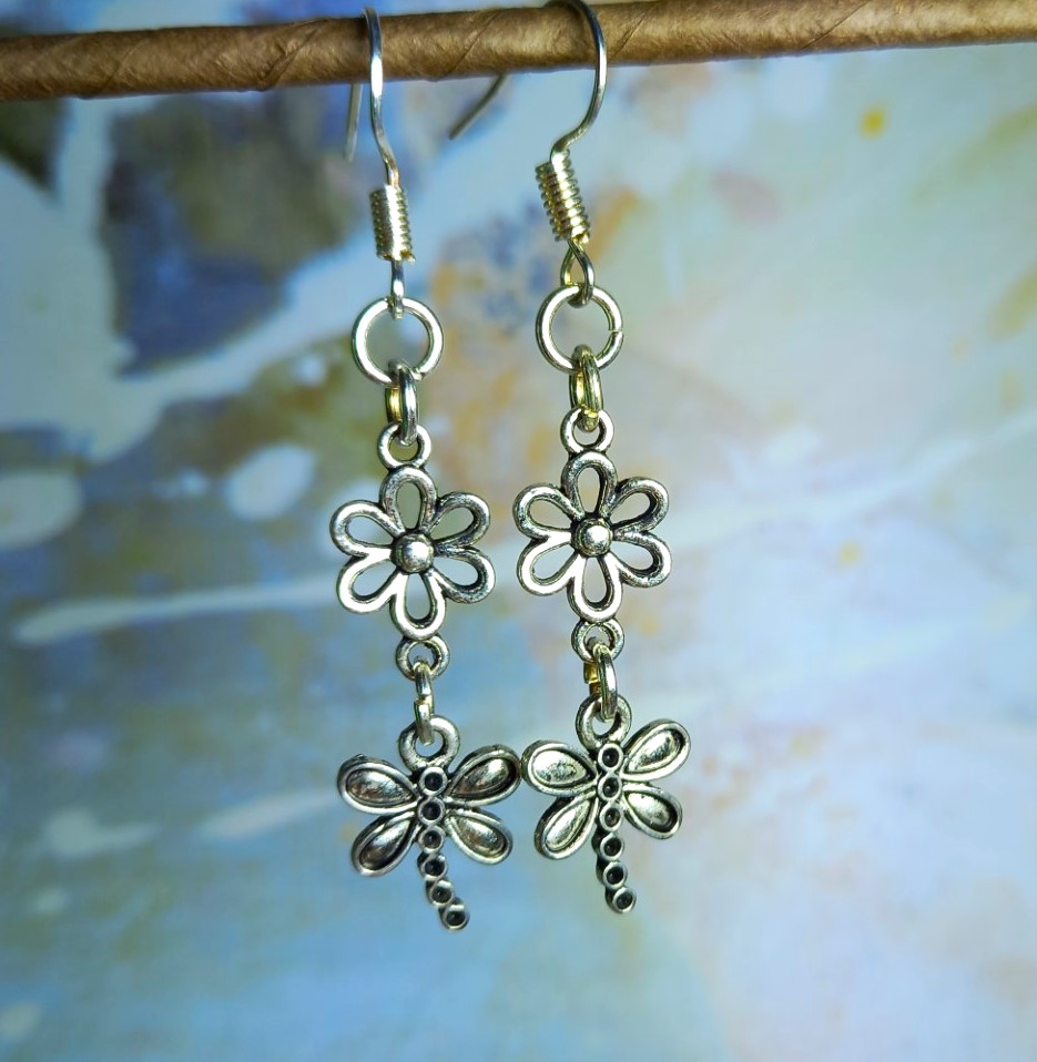 These delicate earrings are approximately 6cm long featuring silver coloured flower leading down to the silver coloured dragonfly, making them a fun accessory for any occasion. Handmade with care.