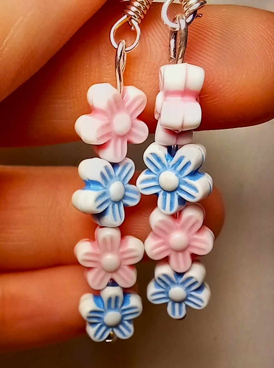 Dangle earrings that feature light weight flowers in shades of baby pink and blue. Ideal for a baby shower or gender reveal. Handmade