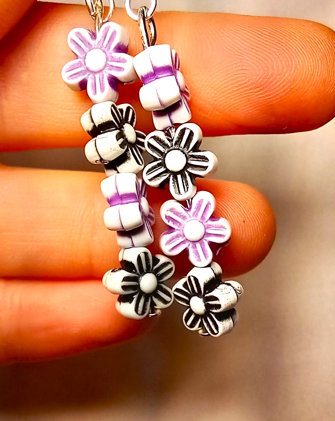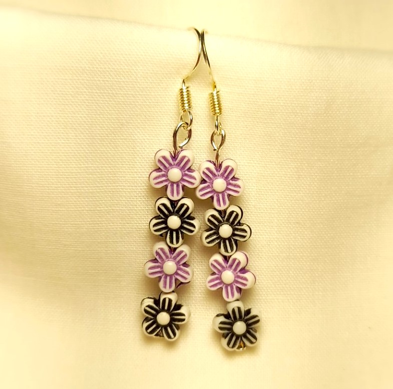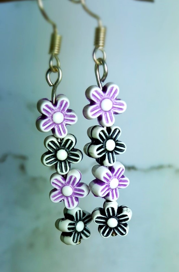 Dangle earrings that feature light weight flowers in shades of purple and black. Perfect for that fun pop of colour. Handmade