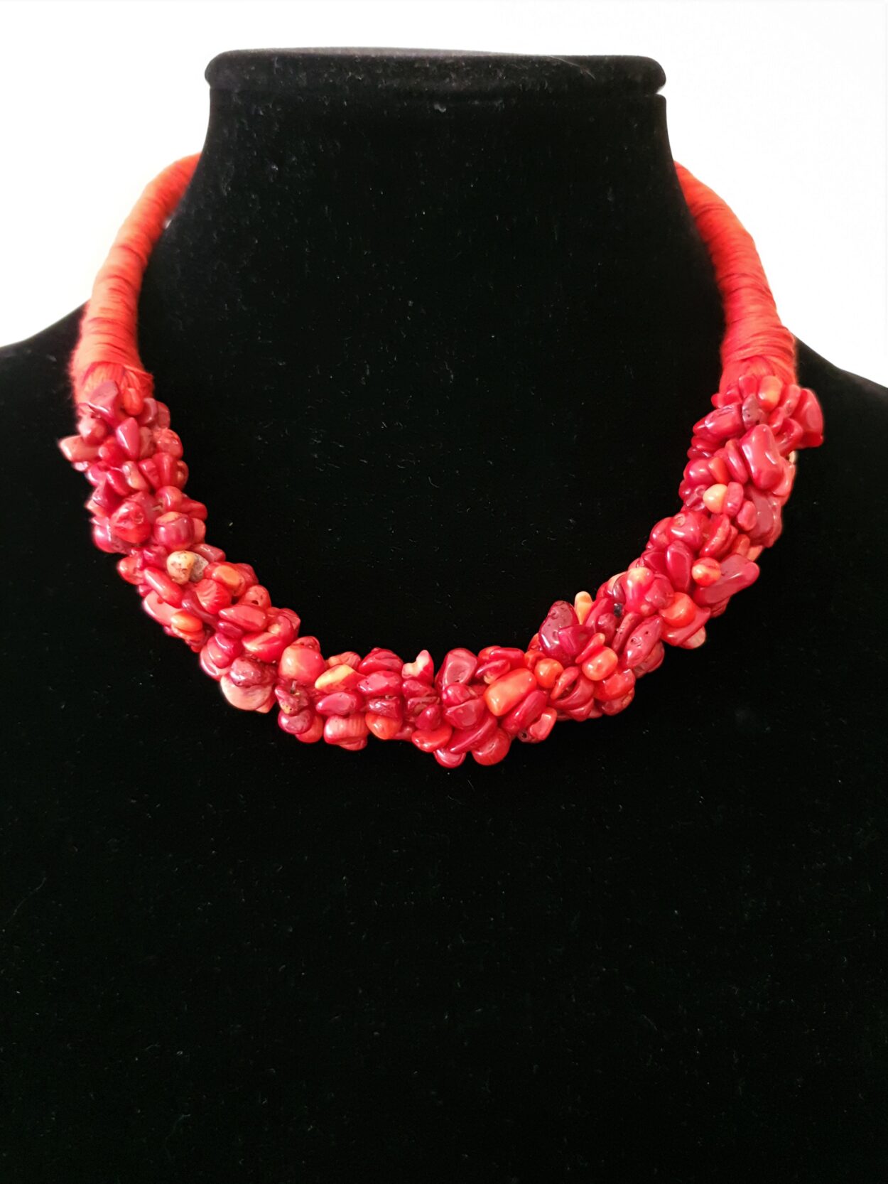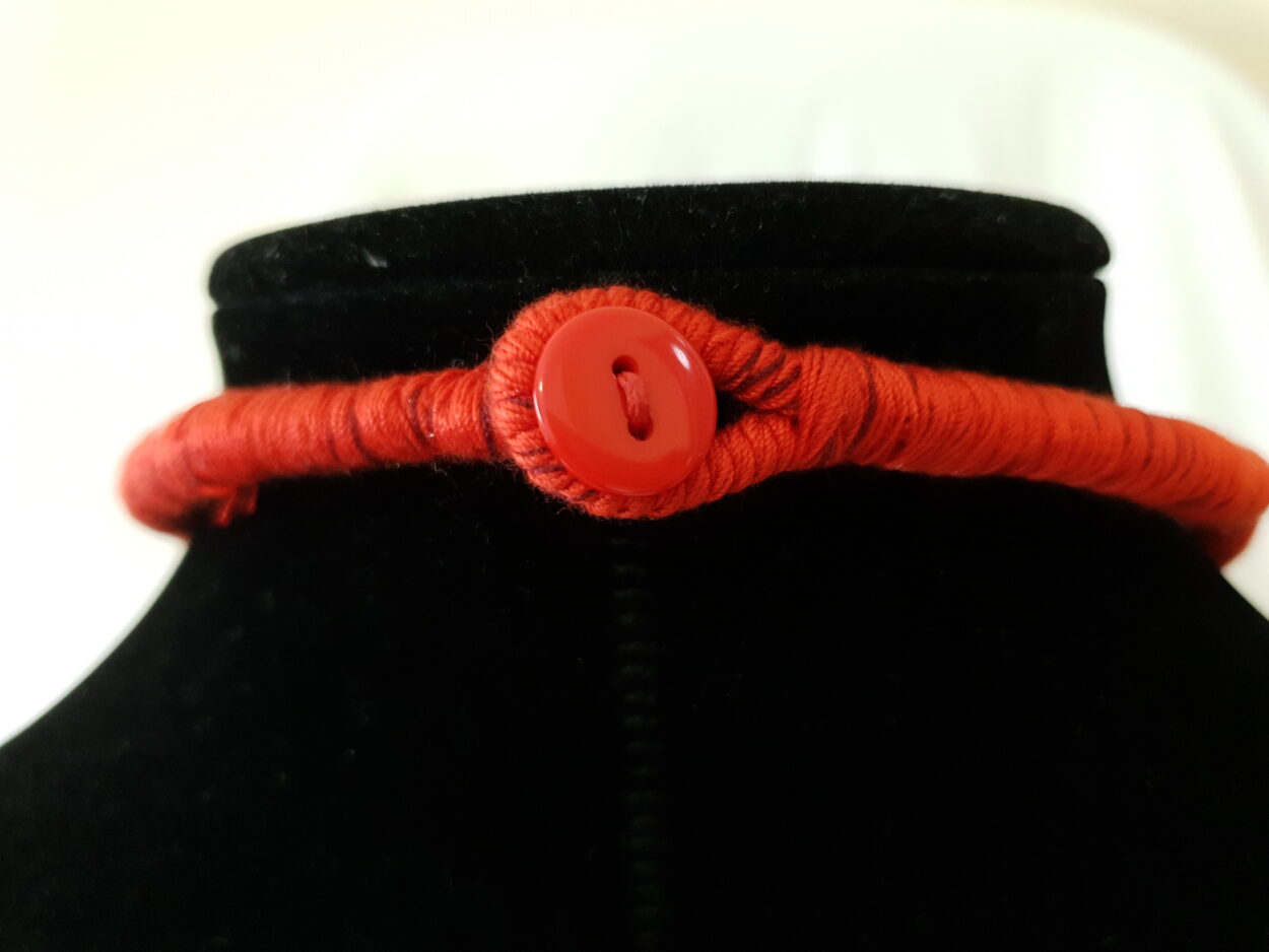 Chunky red rope and red stone necklace with unique button clasp