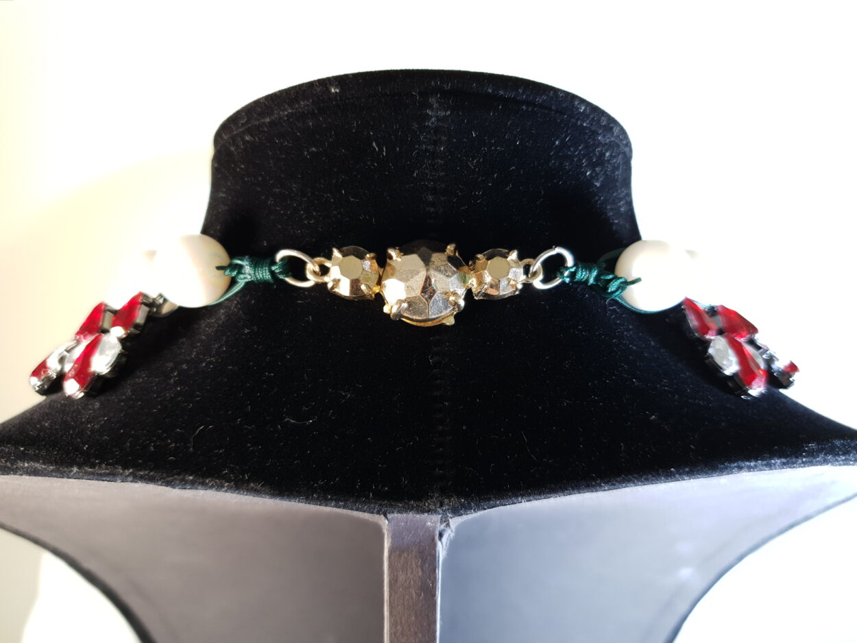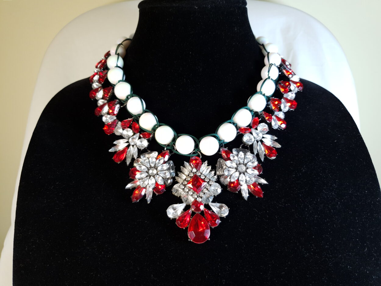 Fashion Necklace with red and clear crystals and white glass beads with gold coloured, magnet clasp. A real statement piece