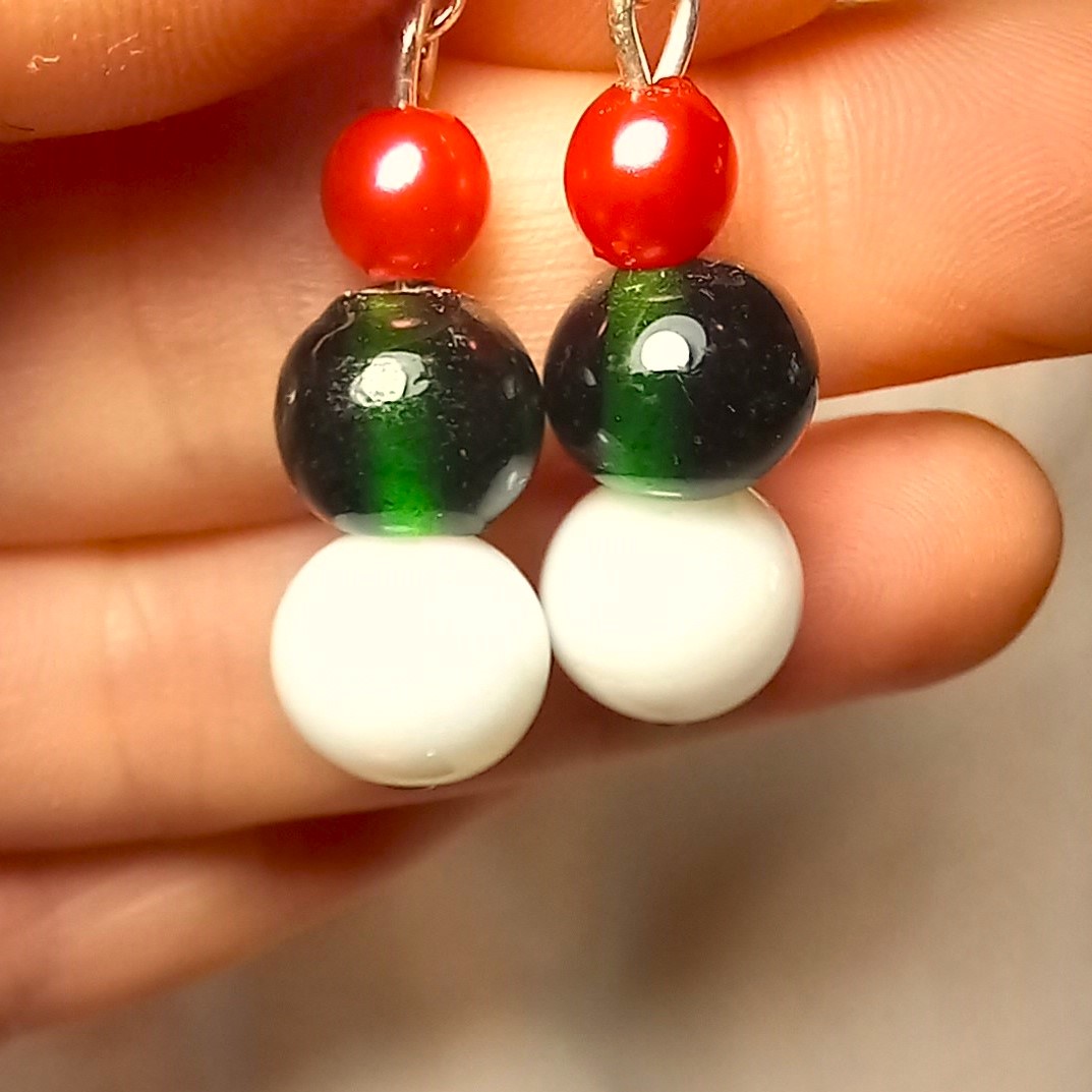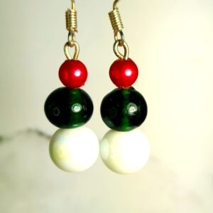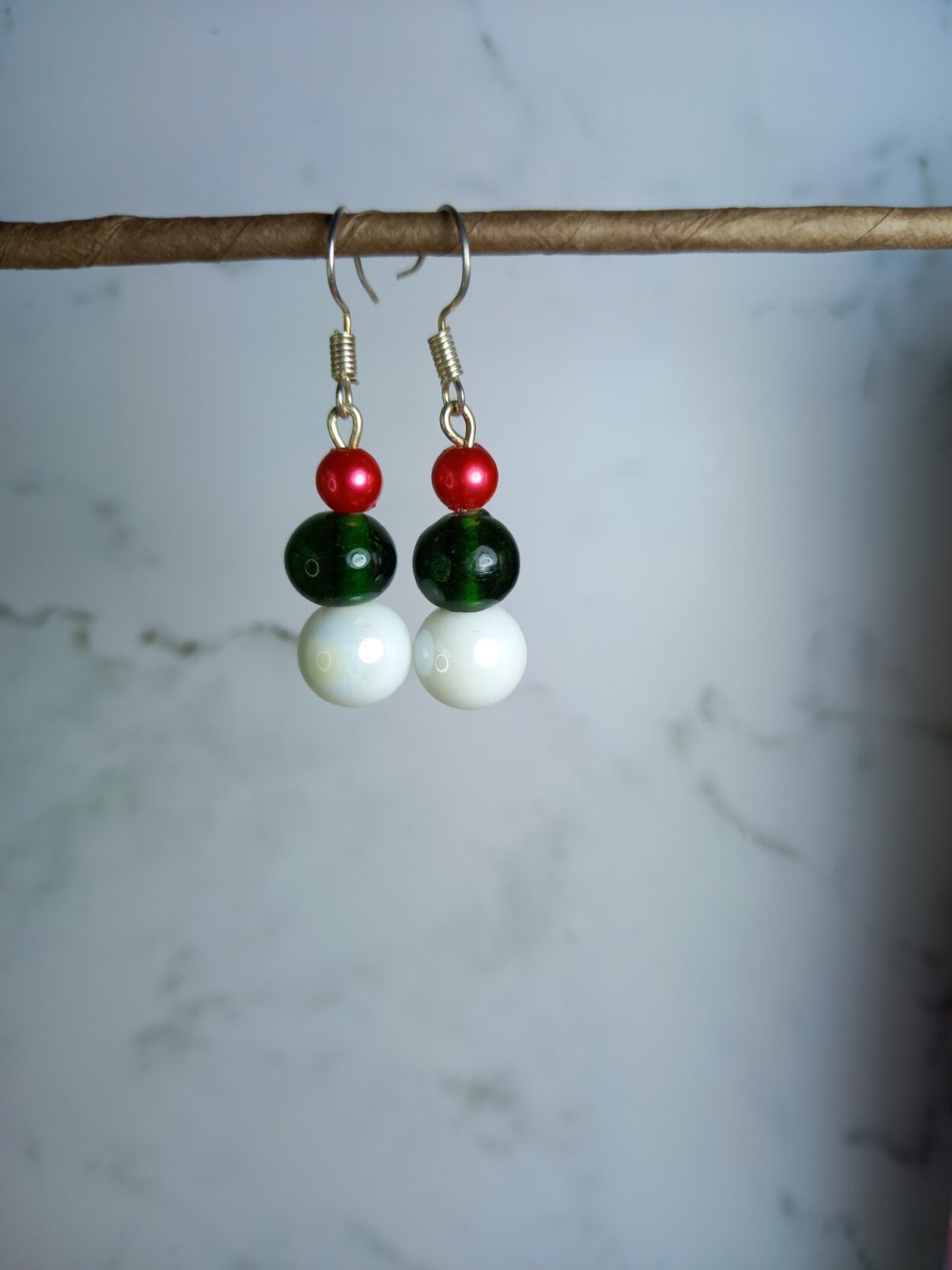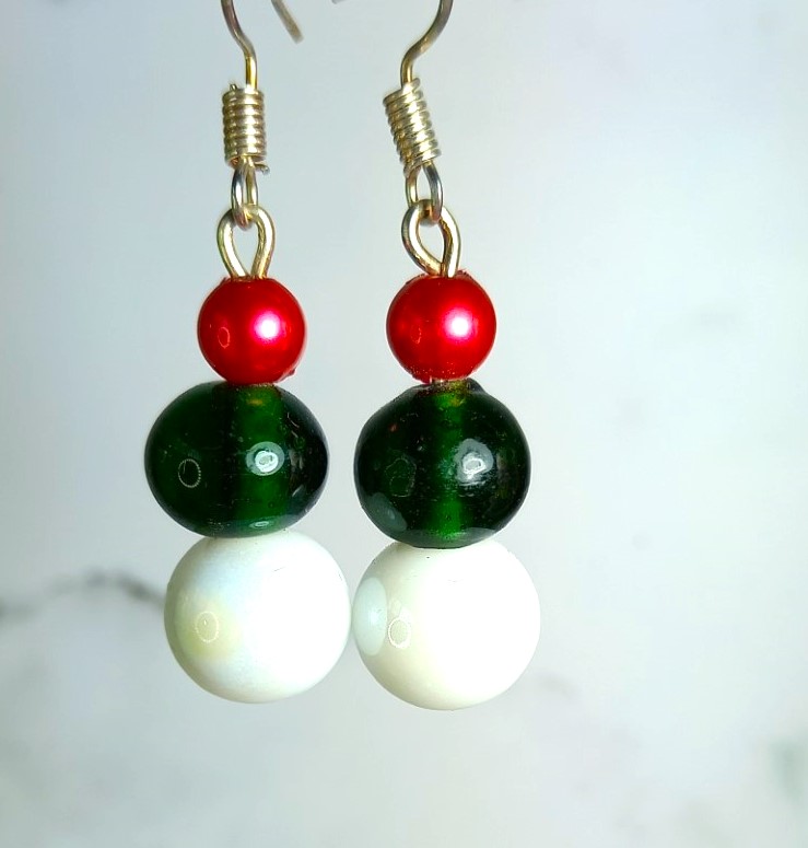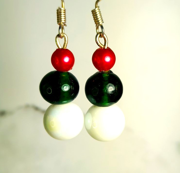 These red, white, and green bead earrings are a delightful blend of colour and style, perfect for any occasion. The purity of white, the lush colour of the glass green bead and the joy of the red metallic look bead gives a delightfully, festive feel and look. Hand made.