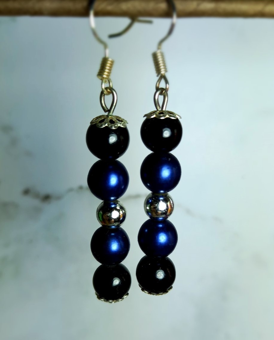 We start in the middle with a small contrasting silver bead then a shimmering metallic coloured blue then classic black glass beads and finished with a silver filigree plate top and bottom. The metallic finish enhances their chic appeal, while the glass beads provide a touch of glamour. Hand made.