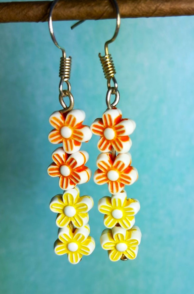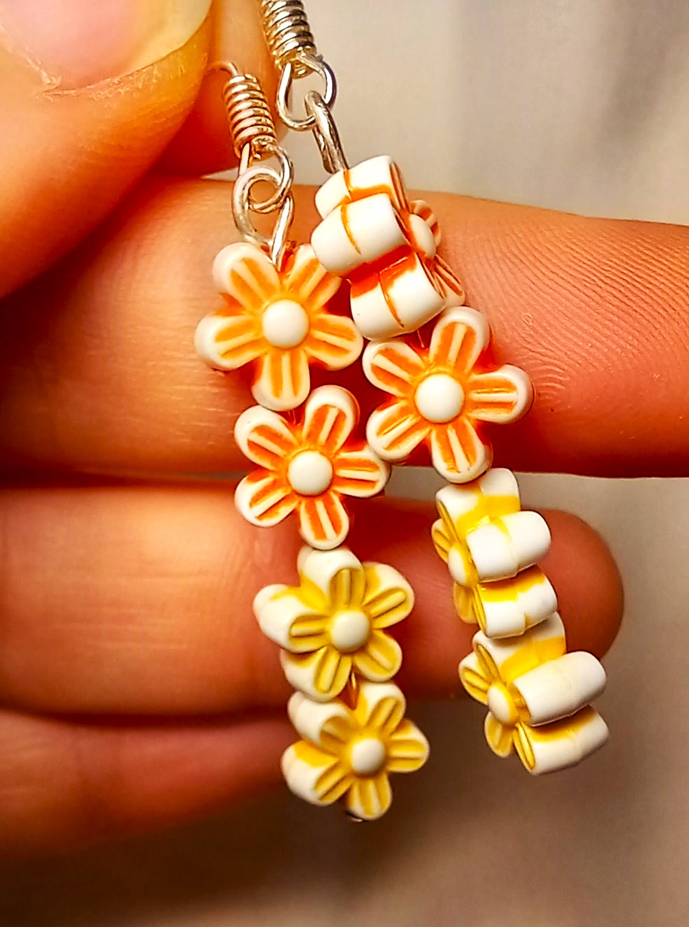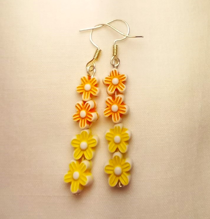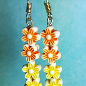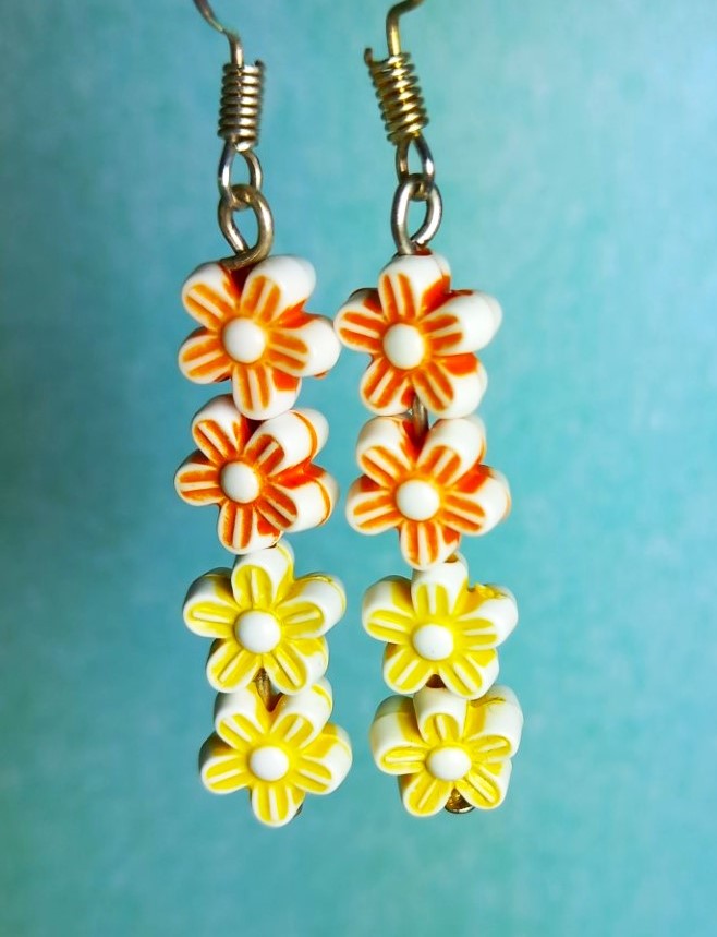 Dangle earrings that feature light weight flowers in shades of orange and yellow.  Perfect for that fun pop of colour.  Handmade